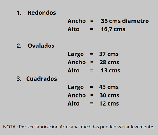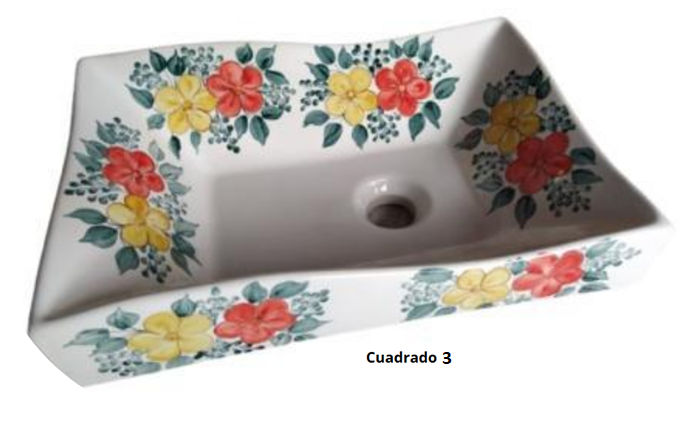 - Diversidad de Diseños: Los lavamanos de ceramica pintados a mano vienen en una amplia variedad de diseños y tamaños, principalmente en motivos florales o inspirados en la naturaleza. Cada pieza es unica y en algunas ocasiones puede ser pesonalizada segun los gustos del cliente. Los hay redondos ovalados, cuadrados y redondos. Los redondos se fabrican en diametro de 36 cms y altura de 16,7 cms; los ovalados se fabrican en un largo de 37 cms, un ancho de 28 cms y un alto de 13 cms; y los cuadrados se fabrican en un largo de 43 cms, un ancho de 30 cms y un alto de 12 cms.